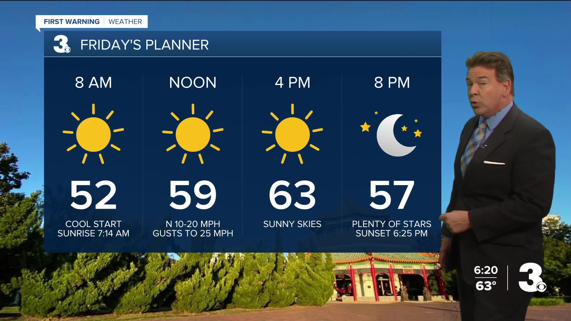 Expect bright sunshine again on Friday with a cool breeze, gusting around 25 mph.