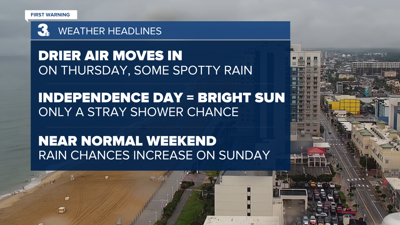 Independence Day will feature plenty of sunshine with only a stray shower possible and highs in the upper 80s.