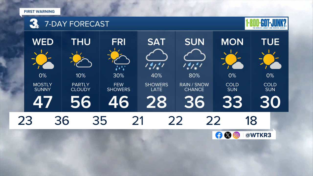Mostly sunny skies should continue on Wednesday with a milder finish in the mid to upper 40s.
