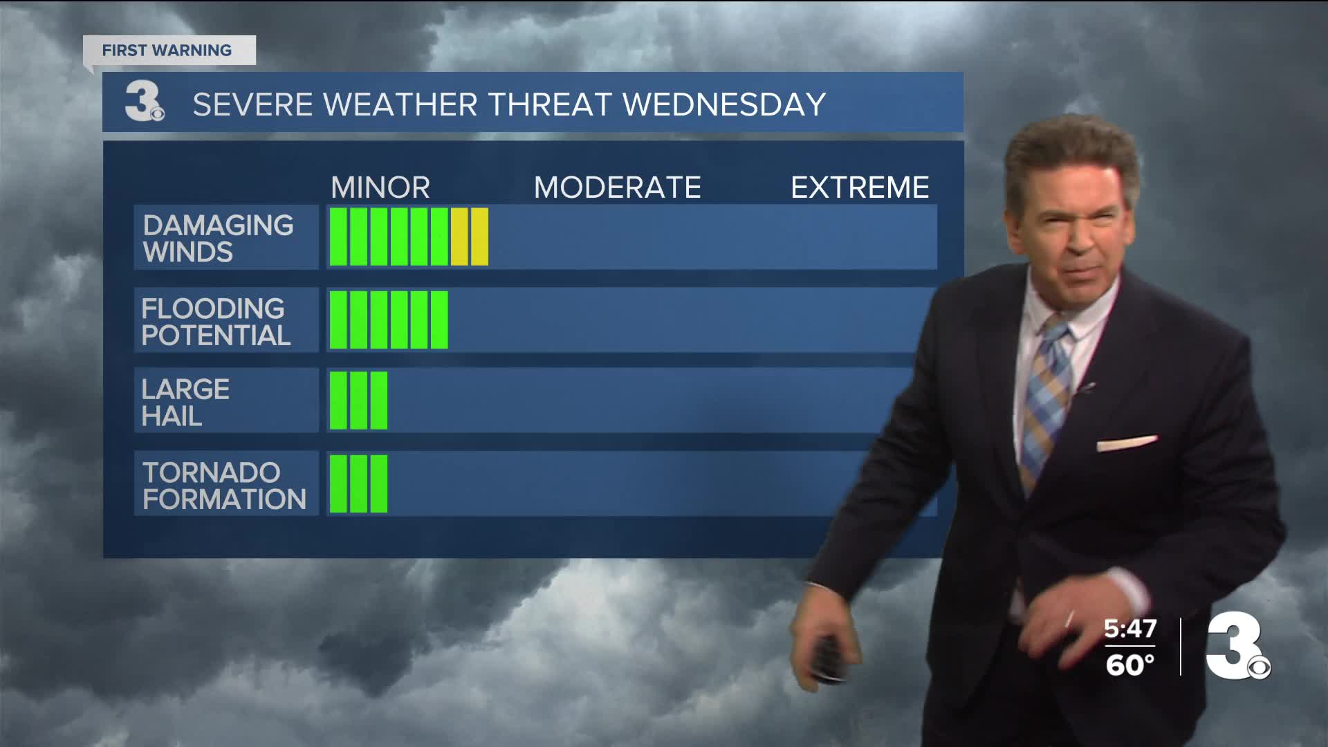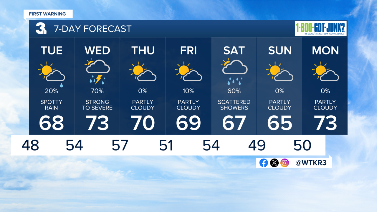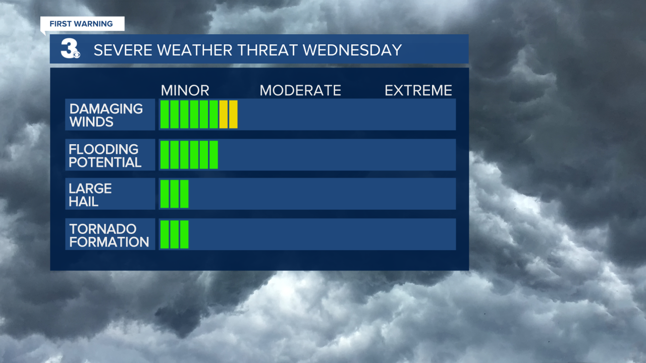 Stronger storms arrive on Wednesday evevning with a Level 1 Severe storm outlook, meaning isolated severe storms with gusts around 60 mph will be possible by evening.