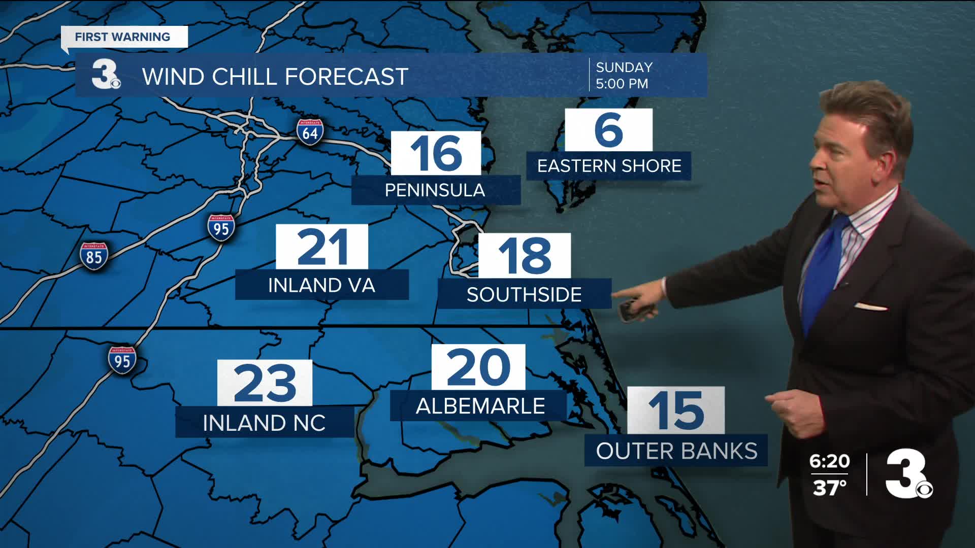 The coldest stretch will arrive on Sunday morning when temperatures drop into the mid teens and "feels like" temperatures drop to near zero.