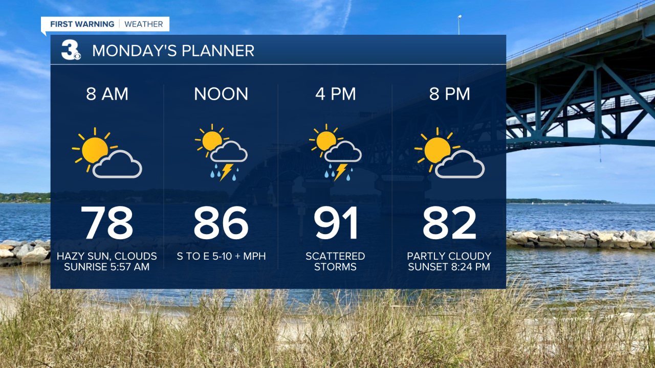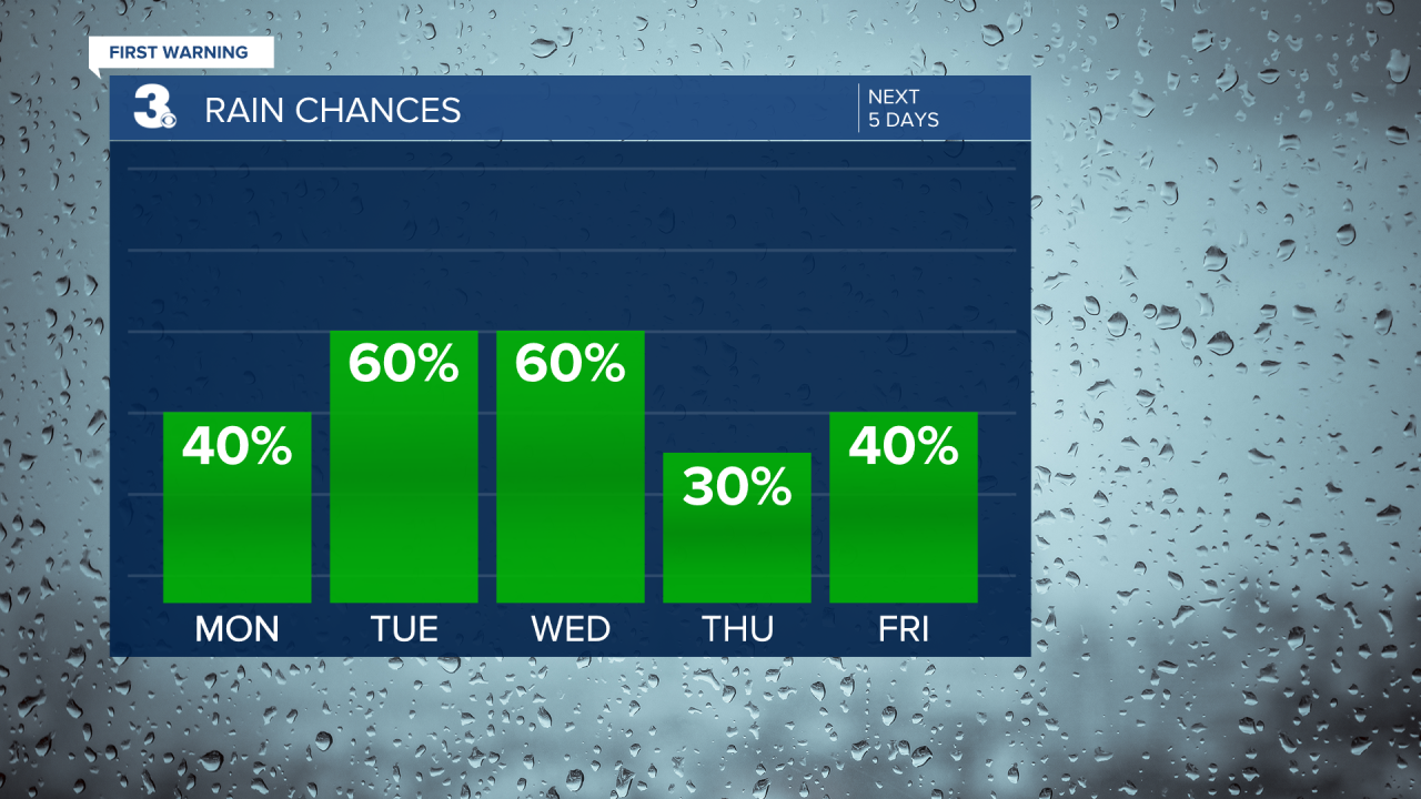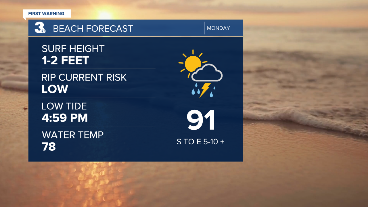 The Summer Heat continues with highs climbing into the lower 90s on Monday with a heat index near 101 degrees. The chance of rain on Monday should be around 40%.