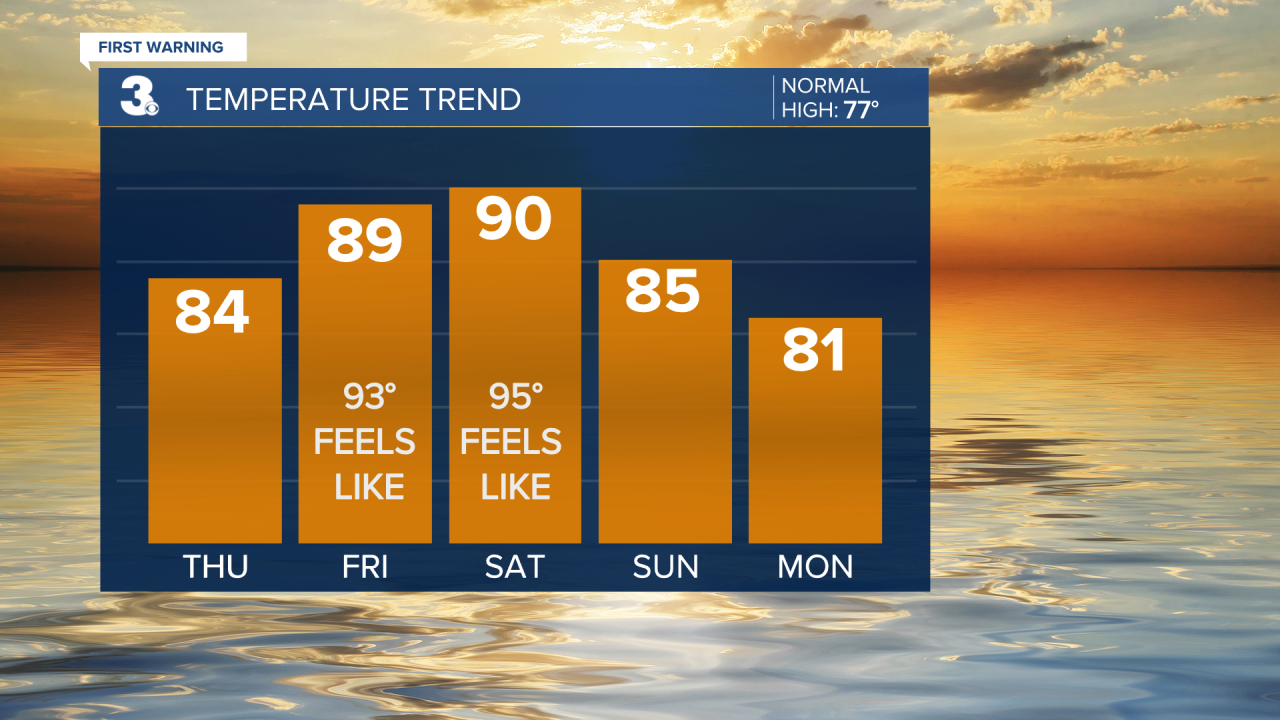 Looking ahead to the weekend, summer heat comes back on both Friday and Saturday with plenty of humidity. Highs near or at 90 degrees with "feels like" temperatures in the lower to mid 90s. Chance of rain & storms on Friday, only spotty at 20% and 30% chance on Saturday, just a few storms possible.