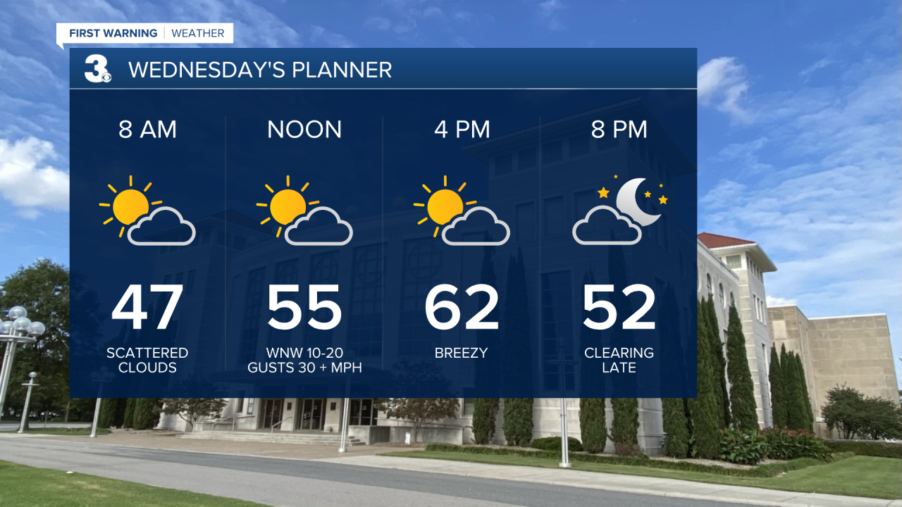 Partly cloudy skies should return on Wednesday, but it will be cooler. and gusty. Tuesday's high in Norfolk, VA, for example, hit 67°. Wednesday's highs will be cooler and should struggle just to reach the lower 60s.