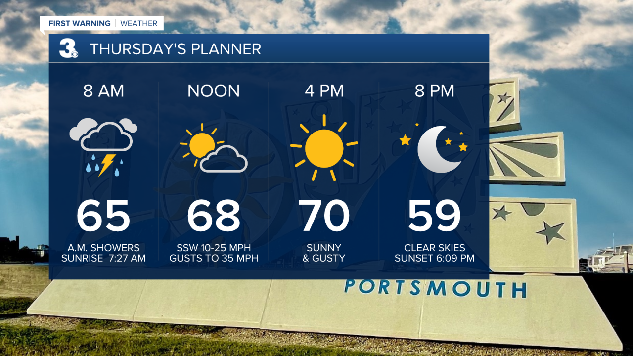 Sunshine should break out between Noon and 3 PM Thursday with gusty winds around 35 mph.