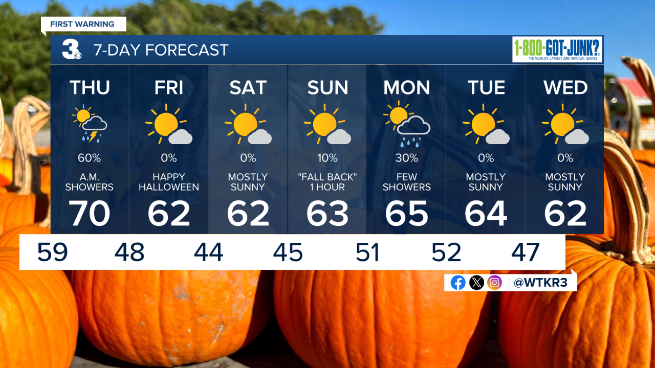 Looking ahead to Halloween, Friday will feature bright sunshine with gusty winds and a high of 62 degrees. Wind gusts on Friday could range from 30 to 40 mph.