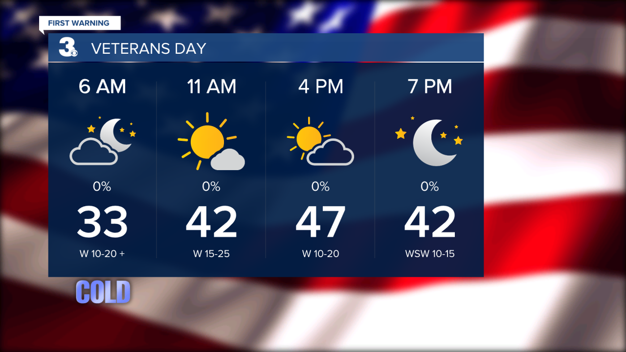 Meanwhile, blustery wind chills in the 20s and 30s should adequately describe Veterans Day this Tuesday.