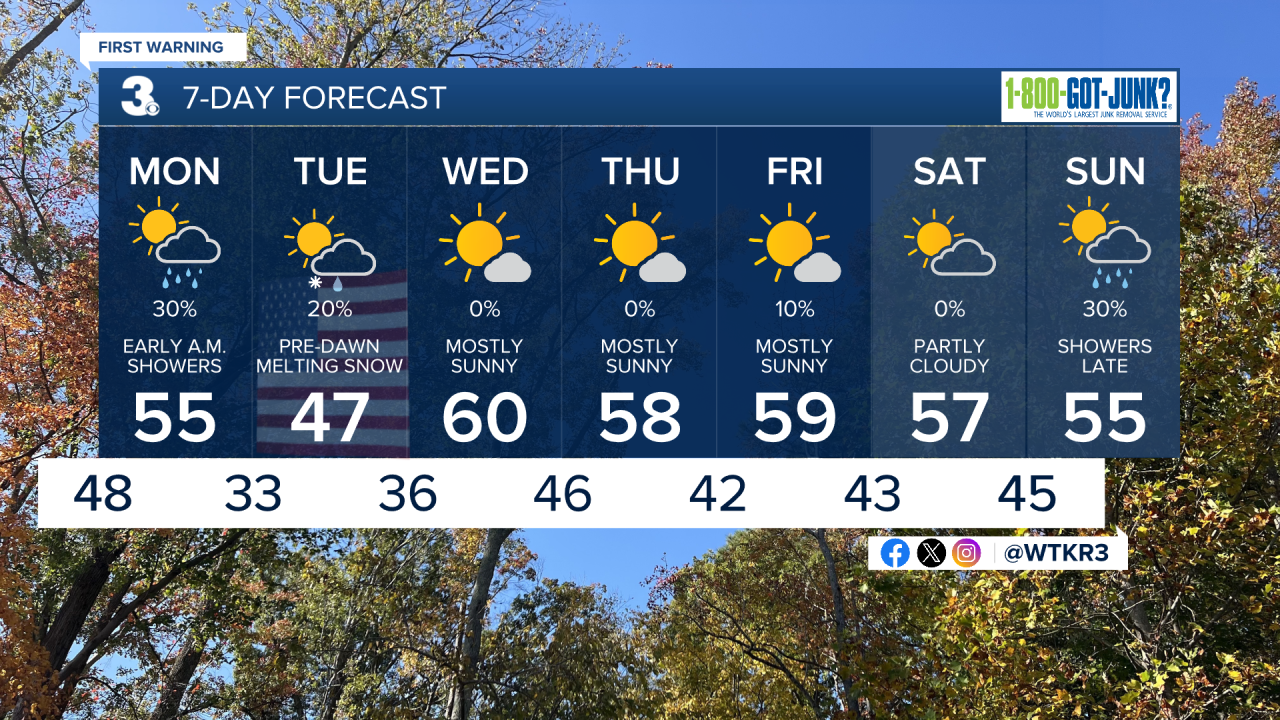 The chance of some wet snow showers & flurries, mixing with some rain, will be possible late Monday night into the pre-dawn hours of Veterans Day. I am not expecting any accumulation, but what does fall could briefly appear on cold car rooftops and even some grassy surfaces.