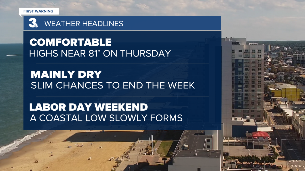 The comfortable stretch of weather will continue into Thursday and beyond, as highs struggle to reach the lower 80s under partly cloudy skies. Scattered clouds will return on Friday as well with highs a bit warmer around 84 degrees. The chance of rain is pretty slim on Thursday and Friday, running around 10% both days.
