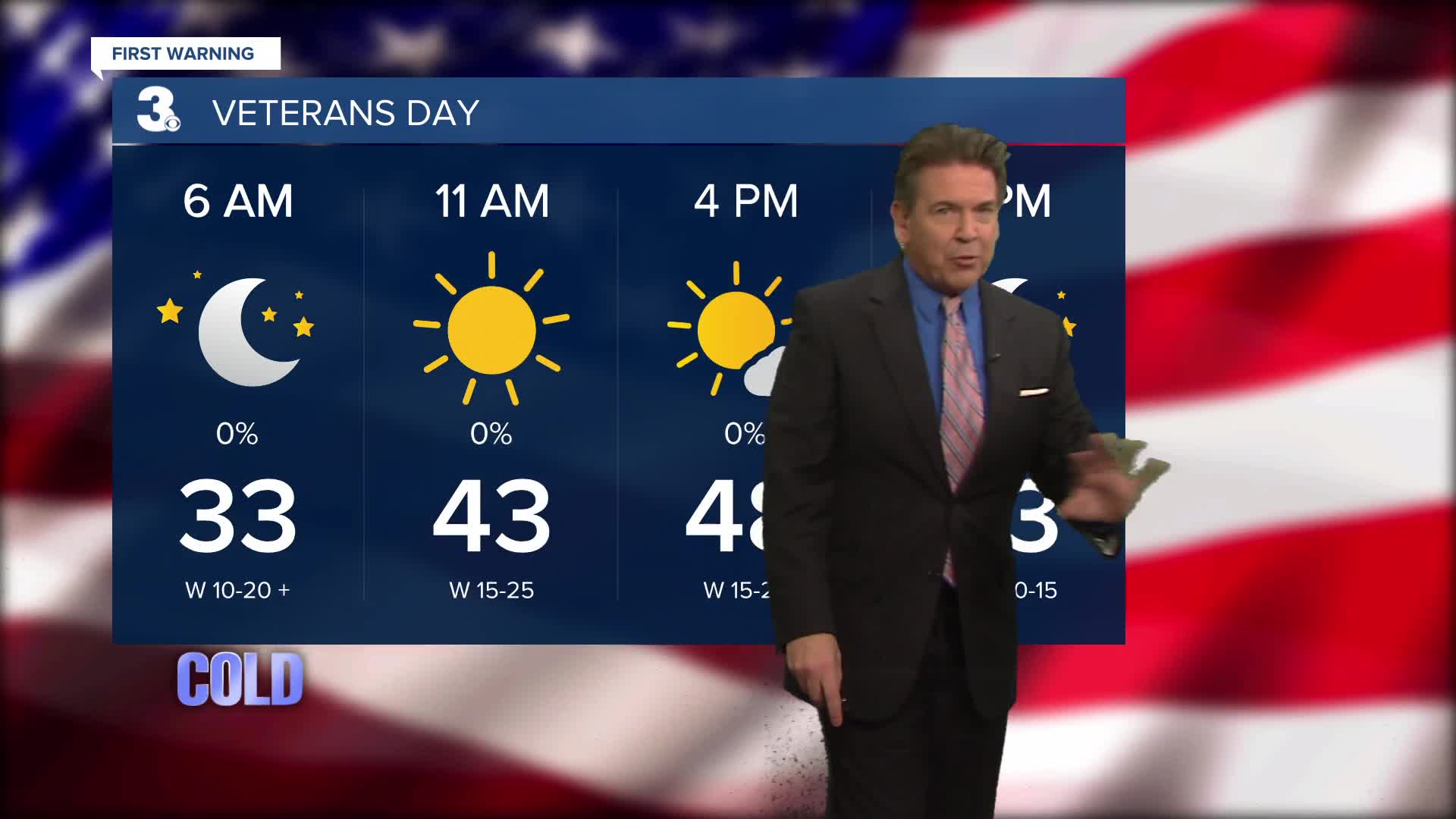 Expect mostly sunny skies to develop on Veterans Day with highs in the upper 40s to near 50°.