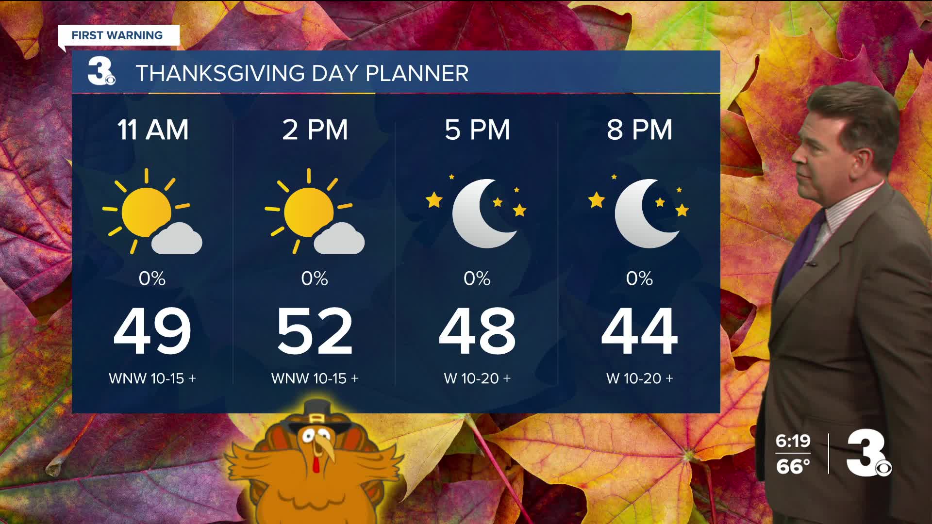 Thanksgiving Day will be sharply colder, roughly 22 degrees colder, with highs in the lower to mid 50s. Look for plenty of sun on Thanksgiving.
