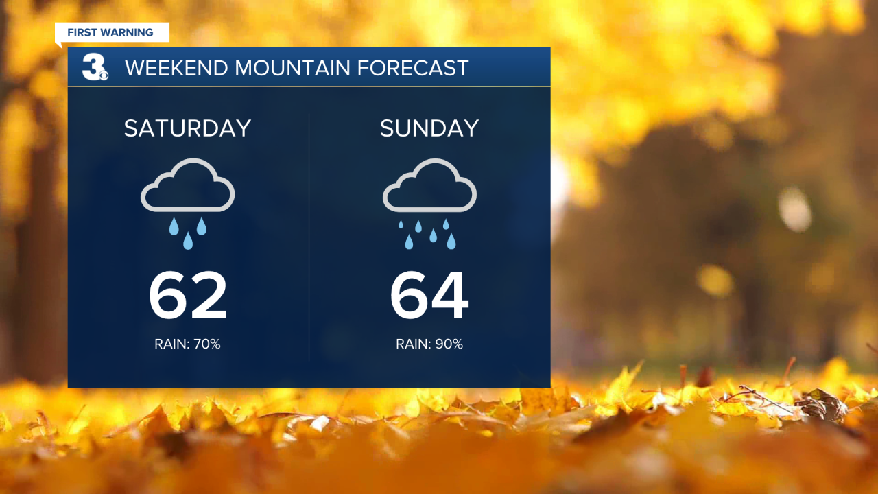 While this would normally be a popular leaf-watching weekend in the mountains, the remnants of Delta will bring a good chance for rain both days this weekend.