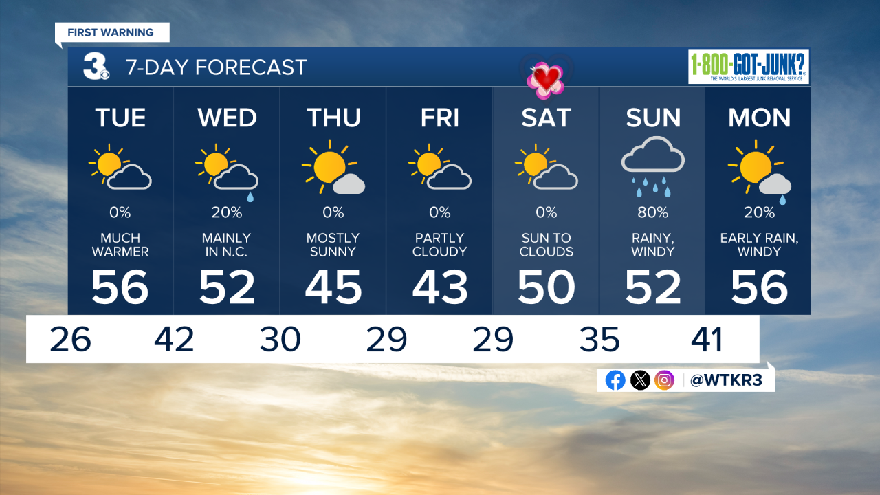 Valentines Day will be nice, with high temperatures around 50 along with sunny skies to start followed some clouds filling in. A potent storm will bring lots of rain (no snow thankfully!) and wind to the region on Sunday.