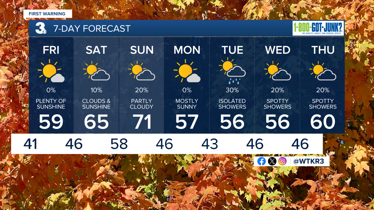 Saturday will start out sunny. Highs will be slightly milder in the mid 60s. Shower chances increase Saturday night and into Sunday morning. The daytime hours Sunday will be dry. Temperatures will be warm for this time of year in the low 70s.