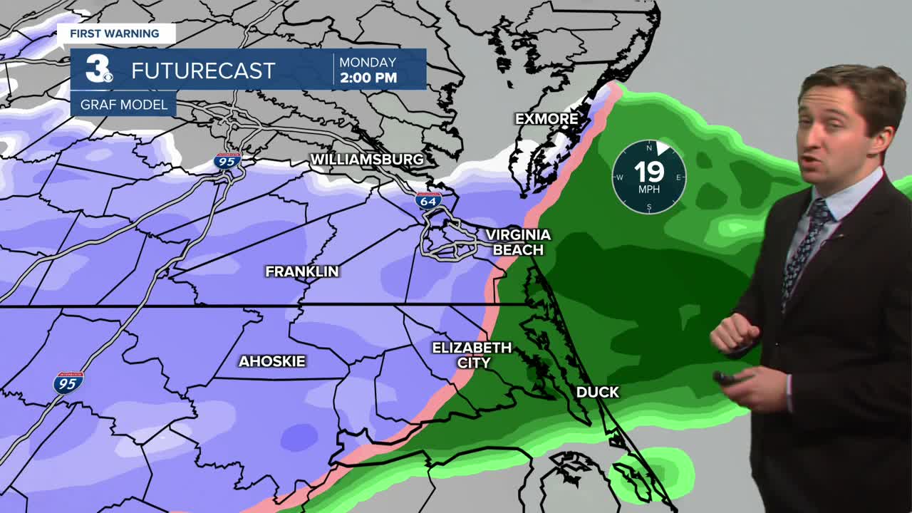 Tomorrow we're tracking another chance for some wet snow. Monday will start off cloudy with temperatures in the upper 30s and low 40s. Temperatures will drop into the low to mid 30s during the afternoon. Rain and wet snow showers will overspread the region around noon, with rain/mix turning to all wet snow around 5 pm. Snowfall amounts will be limited due to above freezing temperatures, with inland Virginia seeing up to an inch of snow. Hampton Roads will see some slushy coatings on grassy surfaces and cars, but road conditions will be mainly wet. Monday will also be windy, with winds out of the NE at 15-25 mph gusting up to 35 mph. Skies will start to clear Monday night as temperatures drop into the 20s and low 30s. Tuesday will be partly cloudy and cool, with high temperatures in the low 40s.