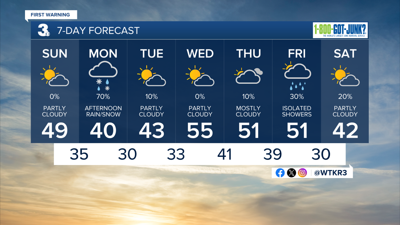 Wednesday and Thursday of this week will be dry and a step warmer, with highs in the mid 50s. Another chance of rain arrives on Friday, with a cool weekend following the chance of showers.