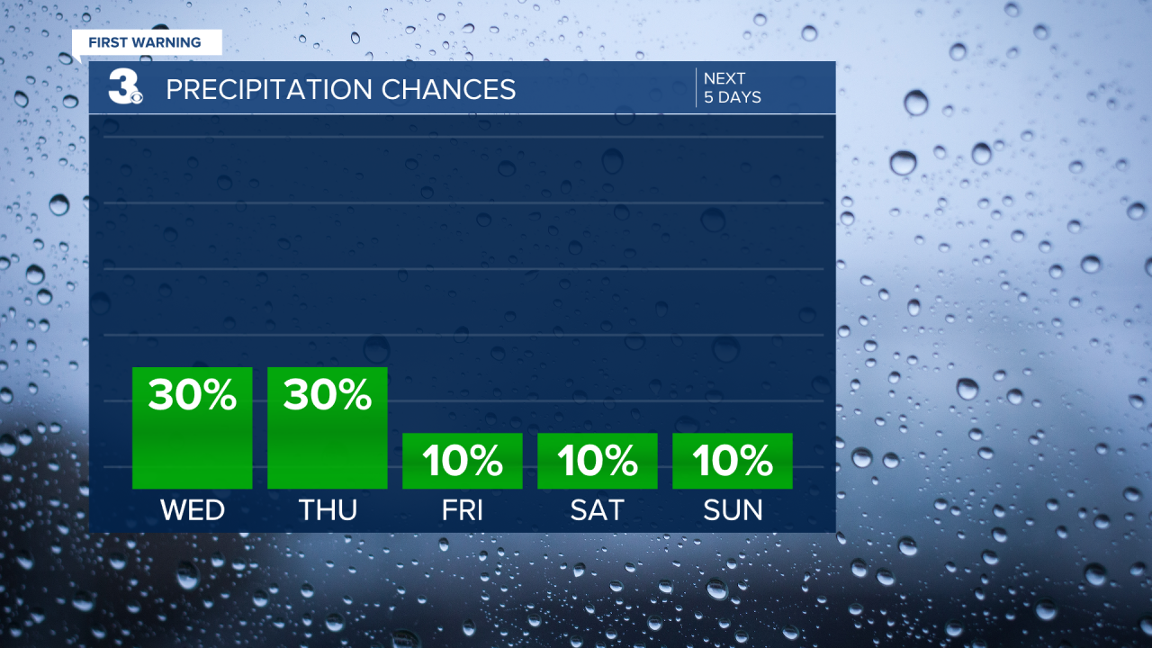 With that front, lingering nearby, a few showers and thunderstorms are still possible on Wednesday and Thursday.