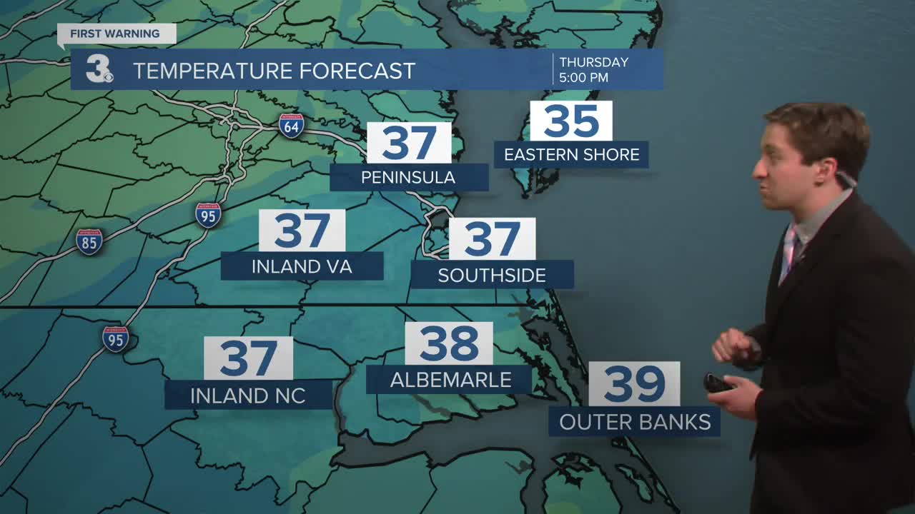 Wednesday will be another day of record warmth, with highs reaching the low to mid 80s. It will be mostly sunny to be partly cloudy, with a stray shower possible during the afternoon. We'll see winds pick up during the afternoon out of the SW at 10-20 mph, with gusts up to 30 mph. Overnight clouds will build, with thunderstorms possible on the Eastern Shore, particularly in Accomack county after midnight. An isolated severe thunderstorm could be possible after midnight for the Eastern Shore, with the main threat being damaging wind gusts, though a non-zero chance for tornadoes and large hail exists as well. Temperatures will stay mild in the 70s and upper 60s. We'll see rain and thunderstorms starting to move into the rest of the region towards sunrise.