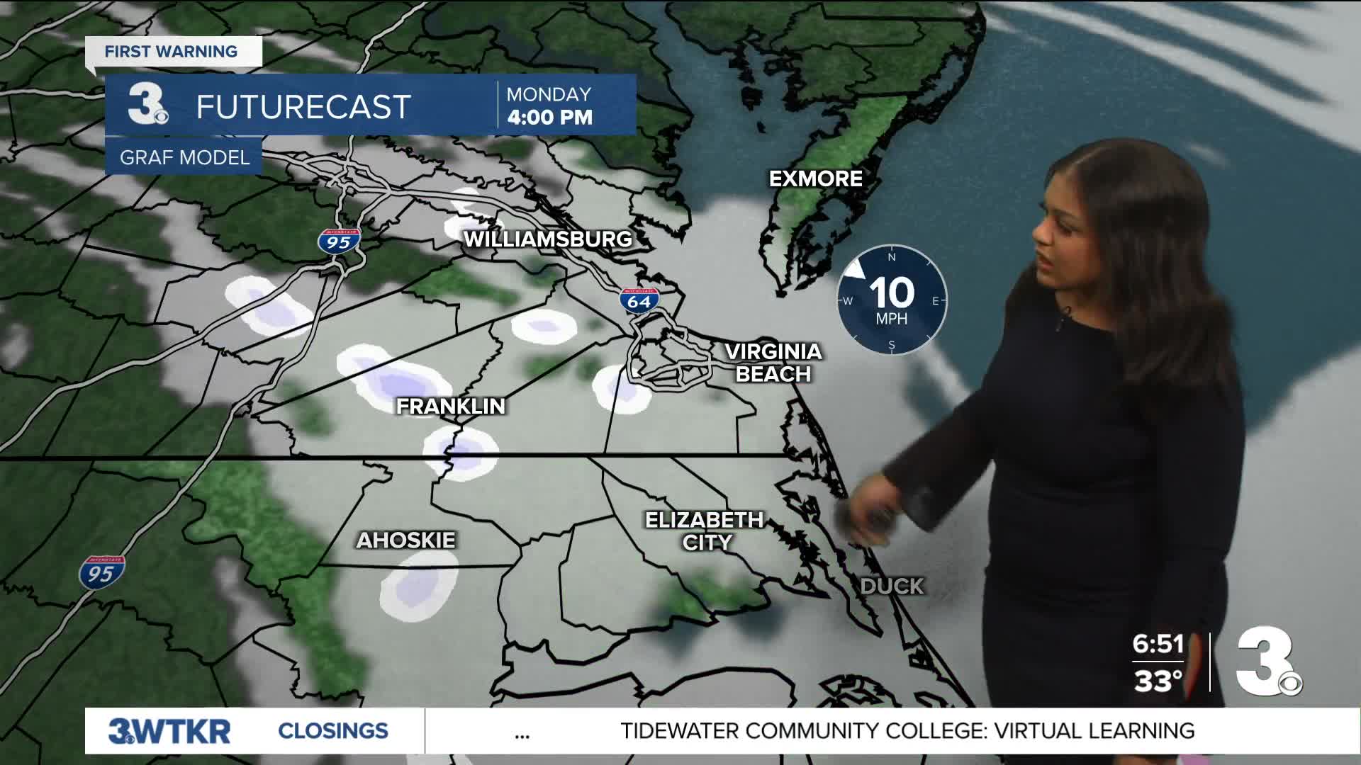 A band of sleet and freezing rain works from west to east through about midnight. Steady rain showers continue for portions of the Outer Banks through Monday morning. As temperatures fall below freezing, areas that are seeing fog will be dealing with poor visibility due to the development of freezing fog. Watch out for some slick spots if you have to commute to work or school on Monday.