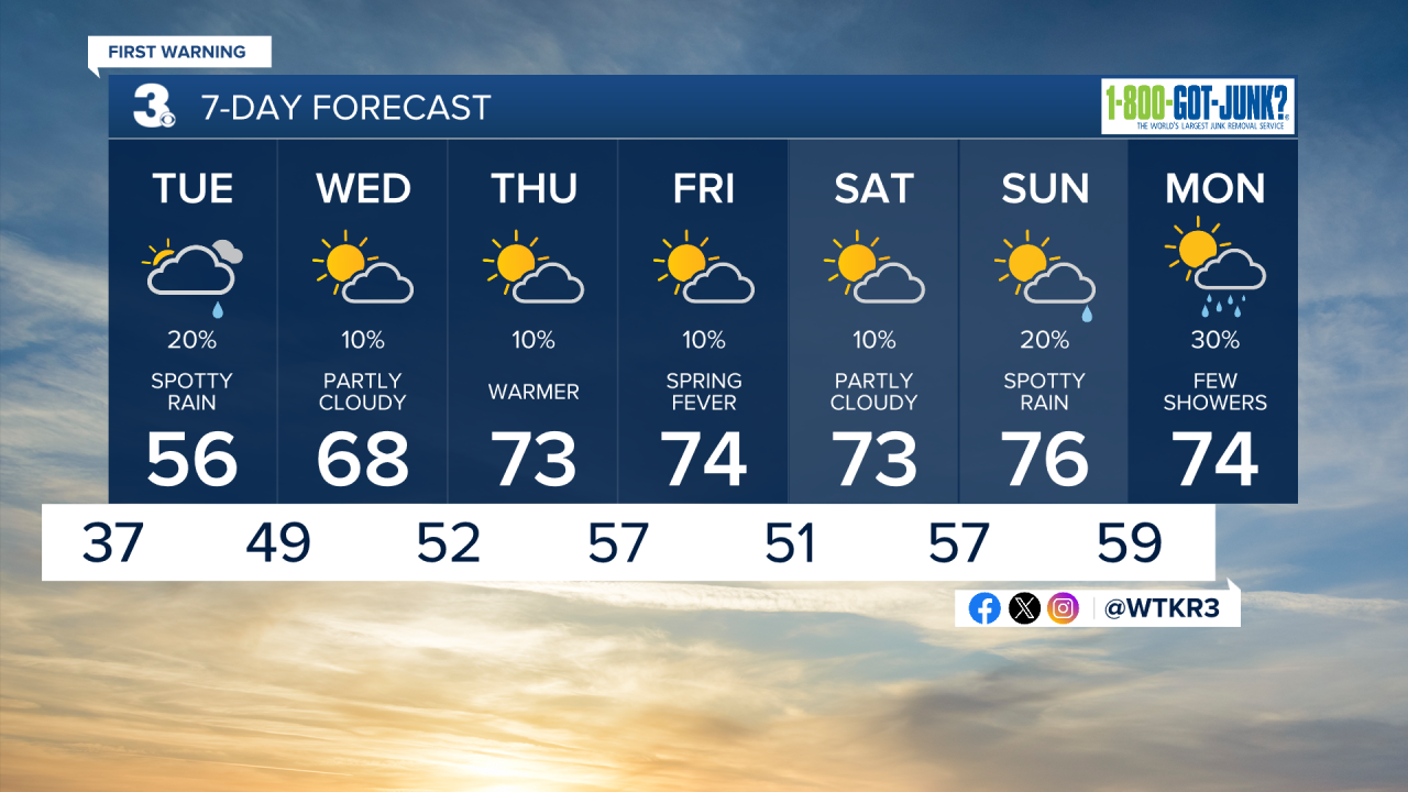 Wednesday will be the start of a significant warming trend for Hampton Roads. We'll see a mix of sun and clouds along with much warmer temperatures in the upper 60s to around 70. Winds will be light out of the W at 5-10. Overnight lows will only drop into the 50s. Thursday will be even warmer, with high temperatures jumping into the low to mid 70s. We'll see winds out of the SW at 5-15 mph.
