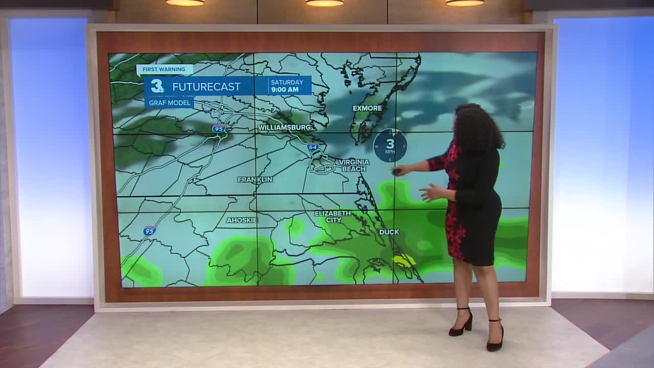 Saturday will be cloudy to start with showers, mainly in North Carolina. By the afternoon we’ll be dry with a thinner layer of cloud cover.