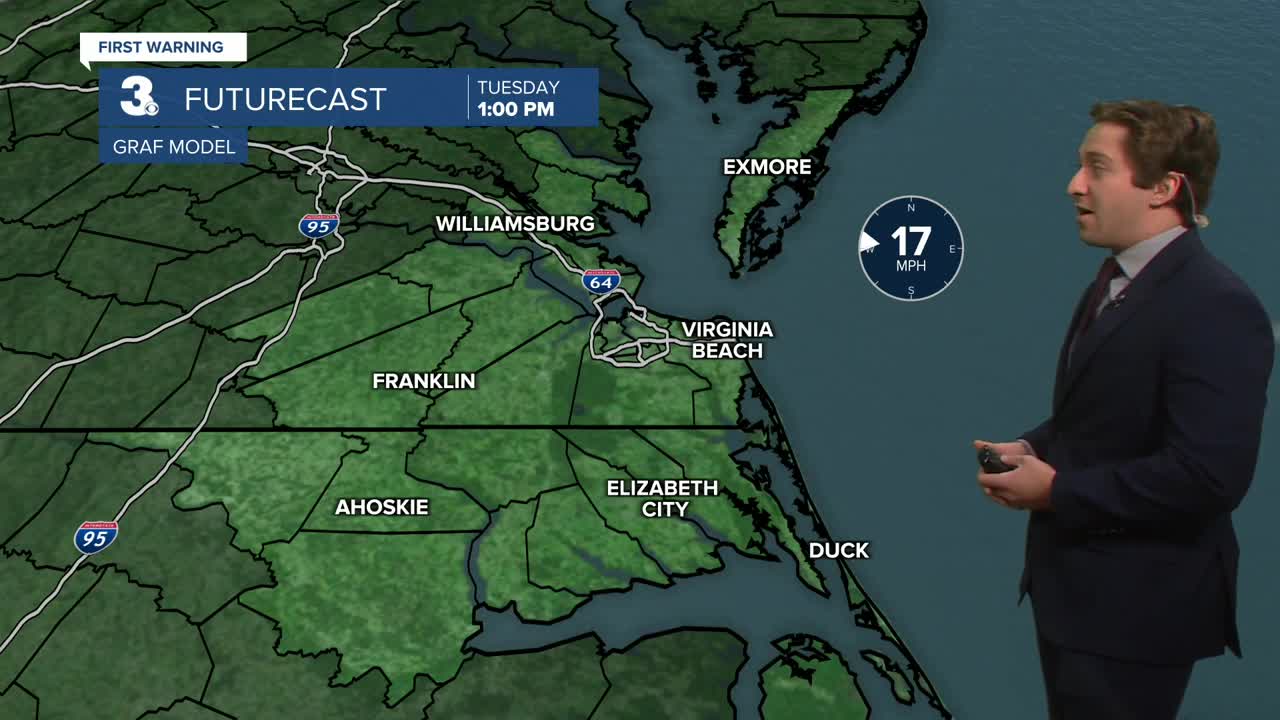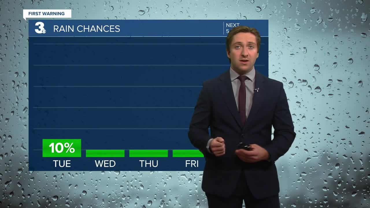 Tomorrow will be closer to normal, with temperatures reaching the low 60s after a cool start to the day. We'll see clear skies along with breezy conditions out of the SW at 10-20 mph. Dry conditions persist for the rest of the week, with Thursday remaining mostly sunny along with near normal temperatures in the upper 50s to 60. Winds will calm down a bit on Thursday, dropping to 10-15 mph out of the WNW.
