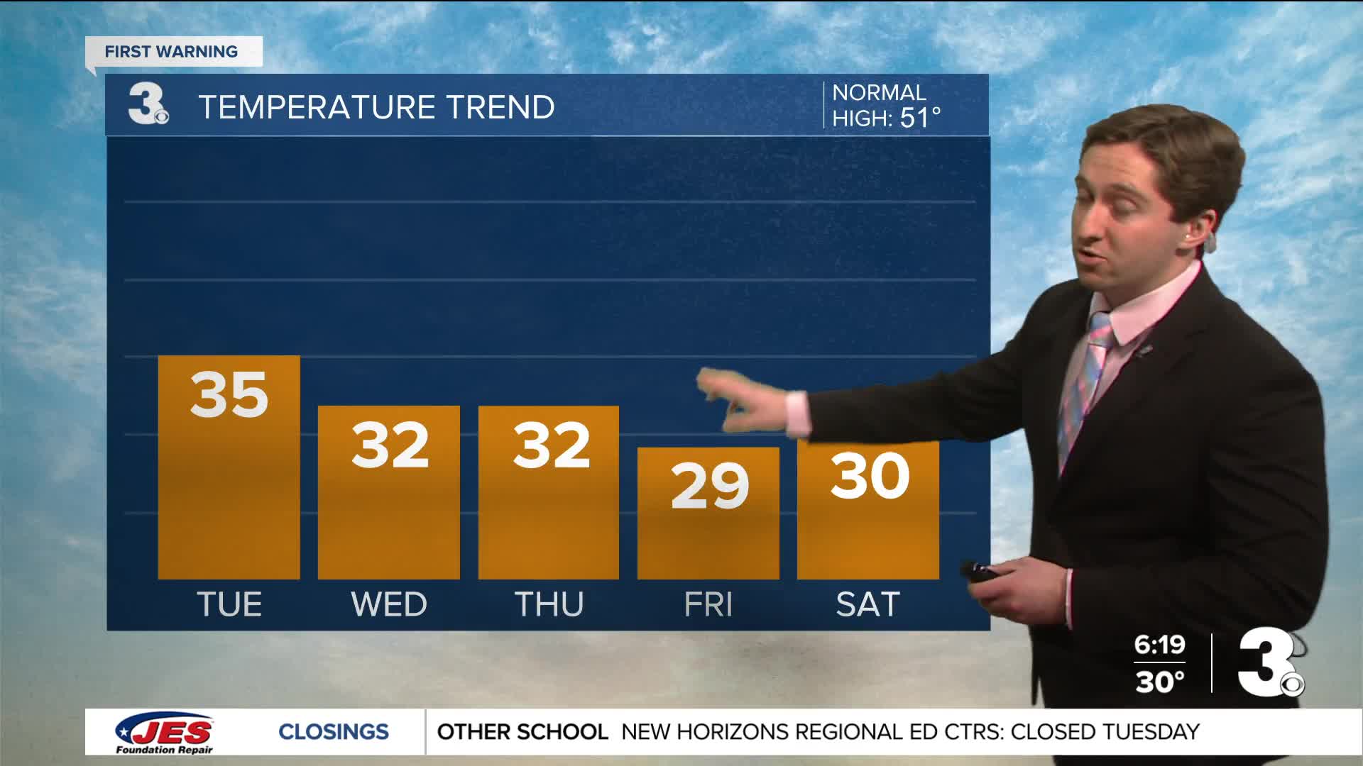 Tomorrow will be sunny and cold with high temperatures in the low to mid 30s. Winds will be out of the SW at 10-15 mph. Overnight Tuesday will be another cold one, with lows in the teens and low 20s.