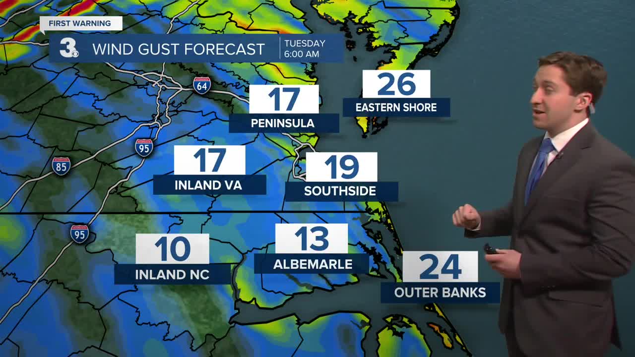 Today will start out cool and windy with temperatures in the low 30s along with winds out of the NW at 20-25 mph with gusts up to 40 mph on the Eastern Shore. Road conditions will still be slippery on the Eastern Shore through the morning after nearly 10" of snow fell in parts of Accomack County. We'll see mostly cloudy skies along with high temperatures reaching the low to mid 40s this afternoon. Overnight skies will clear out as temperatures drop into the 20s. Some tidal flooding is possible today, with nuisance to minor flooding expected during the Monday afternoon high tide around 1 PM to 2 PM.