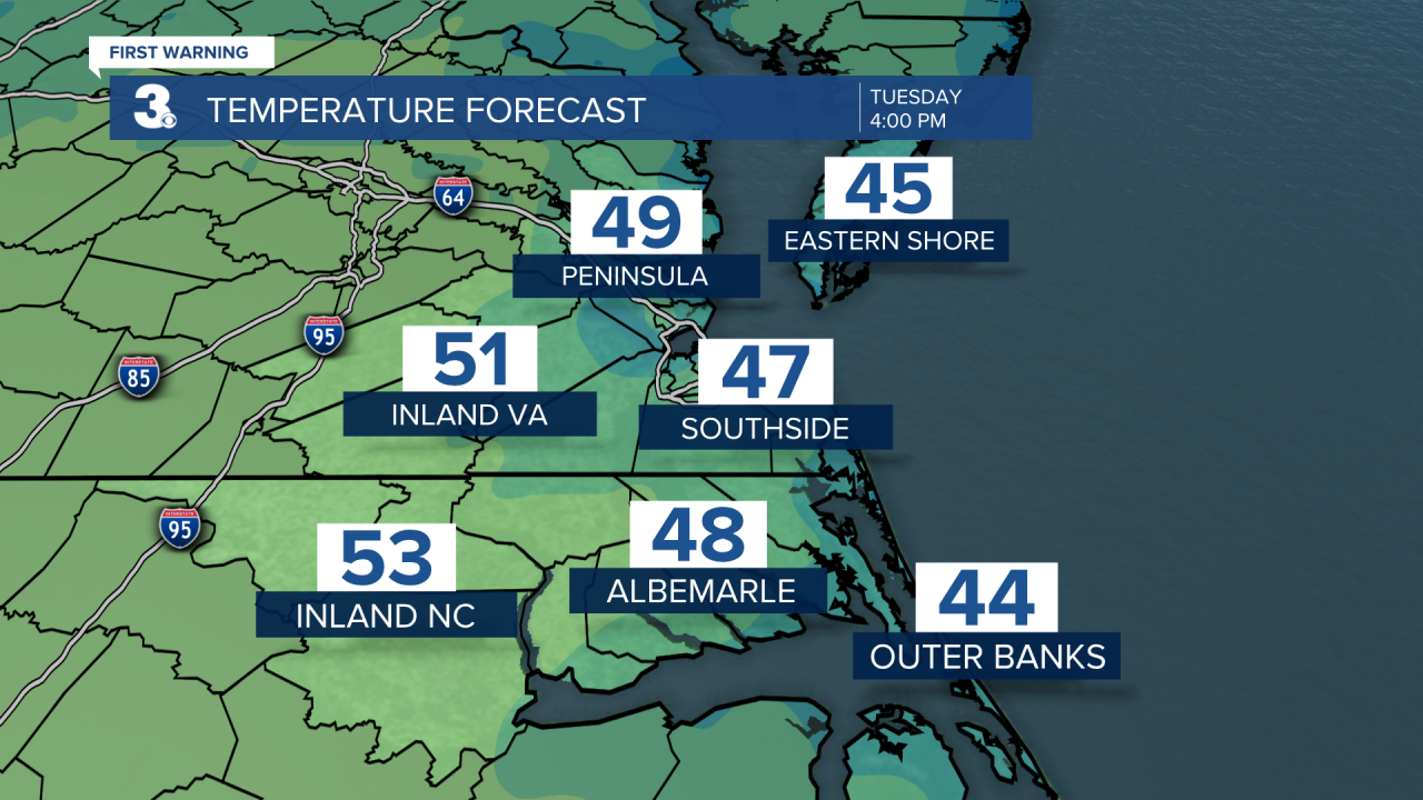 Tomorrow will be chilly. Temperatures start in the low 40s, with high temperatures only getting up to around 50 degrees. We'll see mostly sunny skies besides some passing clouds. Winds will be out of the NE at 10-15 mph. Overnight temperatures will drop into the upper 30s and low 40s.