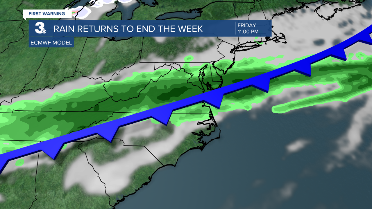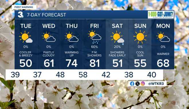 Our next rain chance will move in on Friday. It will be hot, with temperatures reaching the low 80s by the afternoon. Showers and some thunderstorms will move through late Friday afternoon and evening, bringing some cooler weather along with it. This weekend looks mainly dry with temps in the 50s.