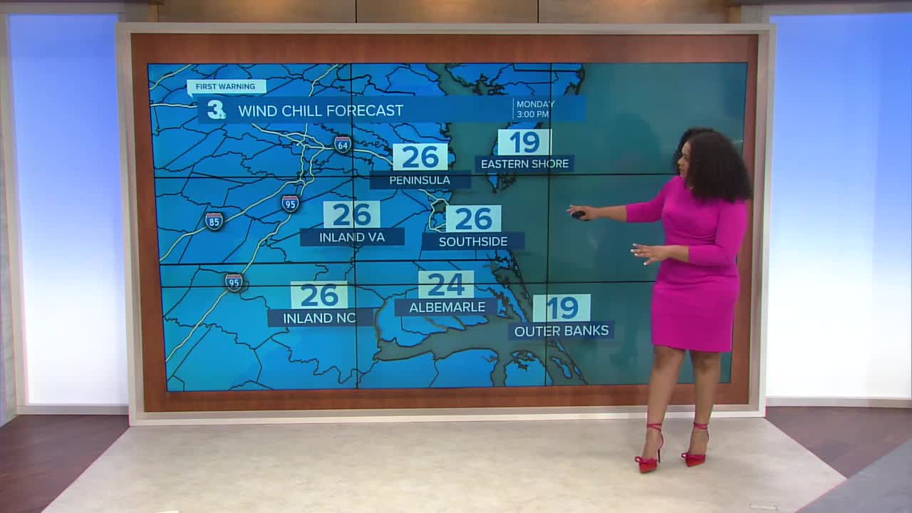Temperatures Monday afternoon reach the low to mid 30s, but it will feel like the low 20s. Skies will be mostly sunny. The winds slack off Monday night.