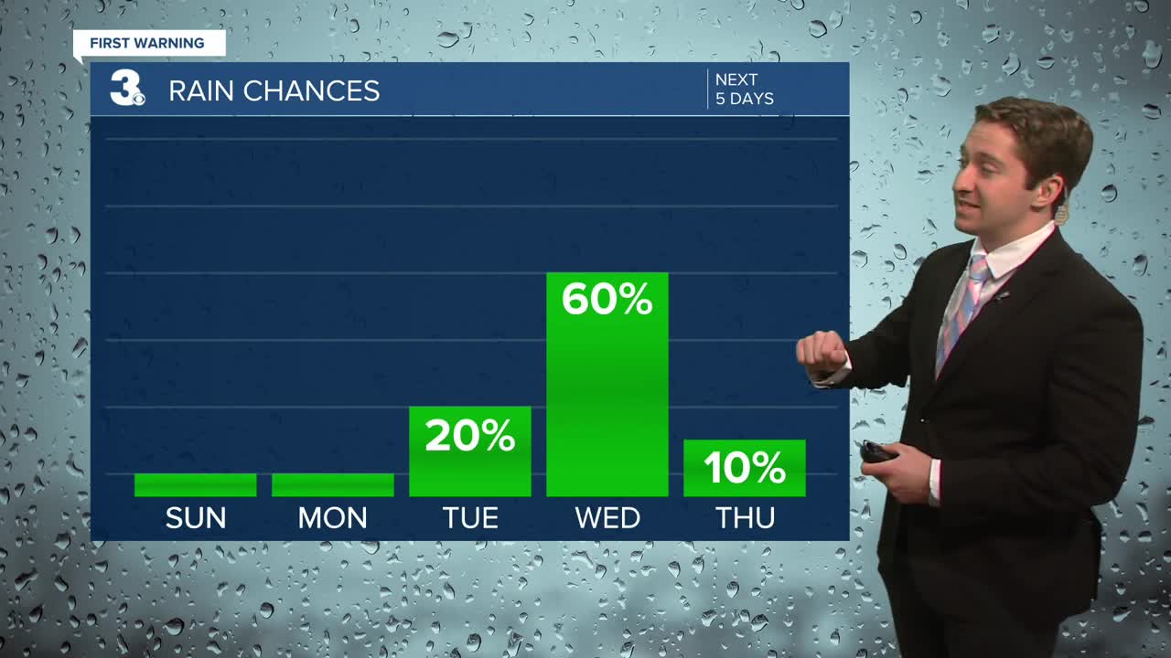 Tuesday night into Wednesday we'll see showers move in ahead of a cold front. On Wednesday we'll see scattered showers and some thunderstorms as a cold front passes through the area. Temperatures will drop by Thanksgiving with drier and cooler weather expected to end the week.