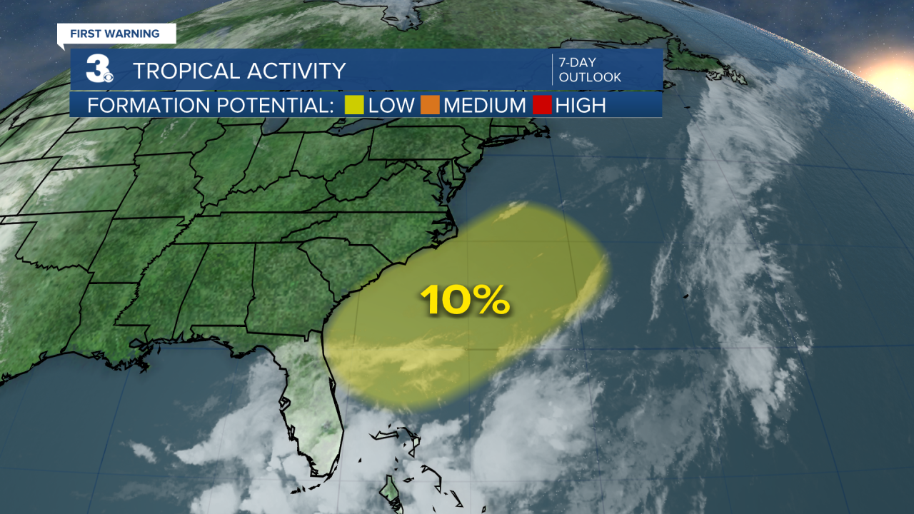 By the end of the week highs will hover near 90 degrees. Rain chances return as well. The National Hurricane Center is monitoring a potential area of development along the southeast coast. A cold front will sweep in and push the moisture out to sea. Regardless of development we'll see isolated storm chances late this week.