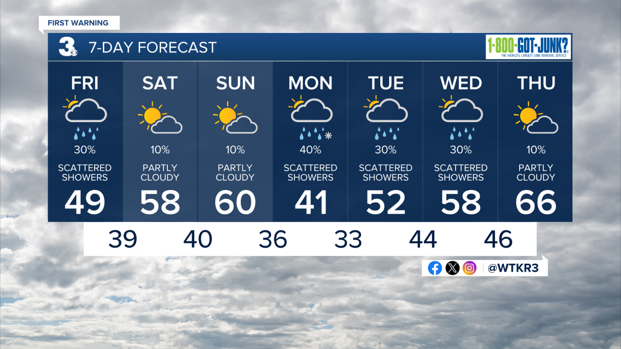 Another system brings the chance of isolated showers early next week. Highs to start the week will be in the upper 30s and low 40s. By the end of next week, we’ll be in the mid 60s.