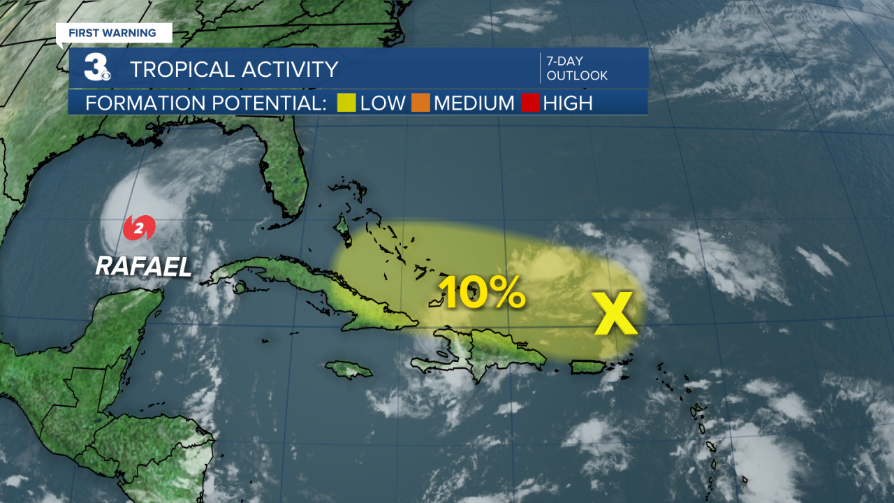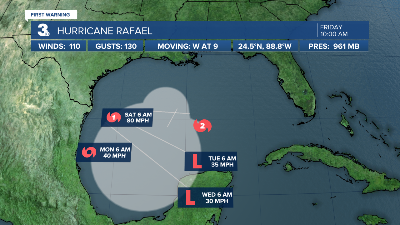 Hurricane Rafael is currently at category 2 strength. It is forecast to move slowly over the central Gulf of Mexico. Where it will go from there is still uncertain. Weakening is expected over the next couple of days.