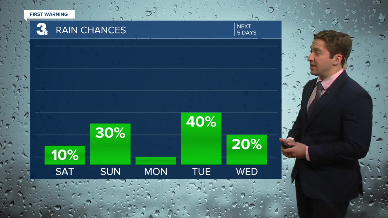 A couple of showers will be possible tomorrow morning, with some clouds to start as well. Clouds will clear out by midday, with sunny skies expected by the afternoon. Highs will reach the upper 60s to low 70s, with winds out of the W at 10-20 mph. Temperatures will drop off quickly during the evening hours as colder air moves in. Temperatures on Monday morning will start in the upper 30s and low 40s. We'll see sunny skies on Monday with cooler high temperatures in the mid 50s.