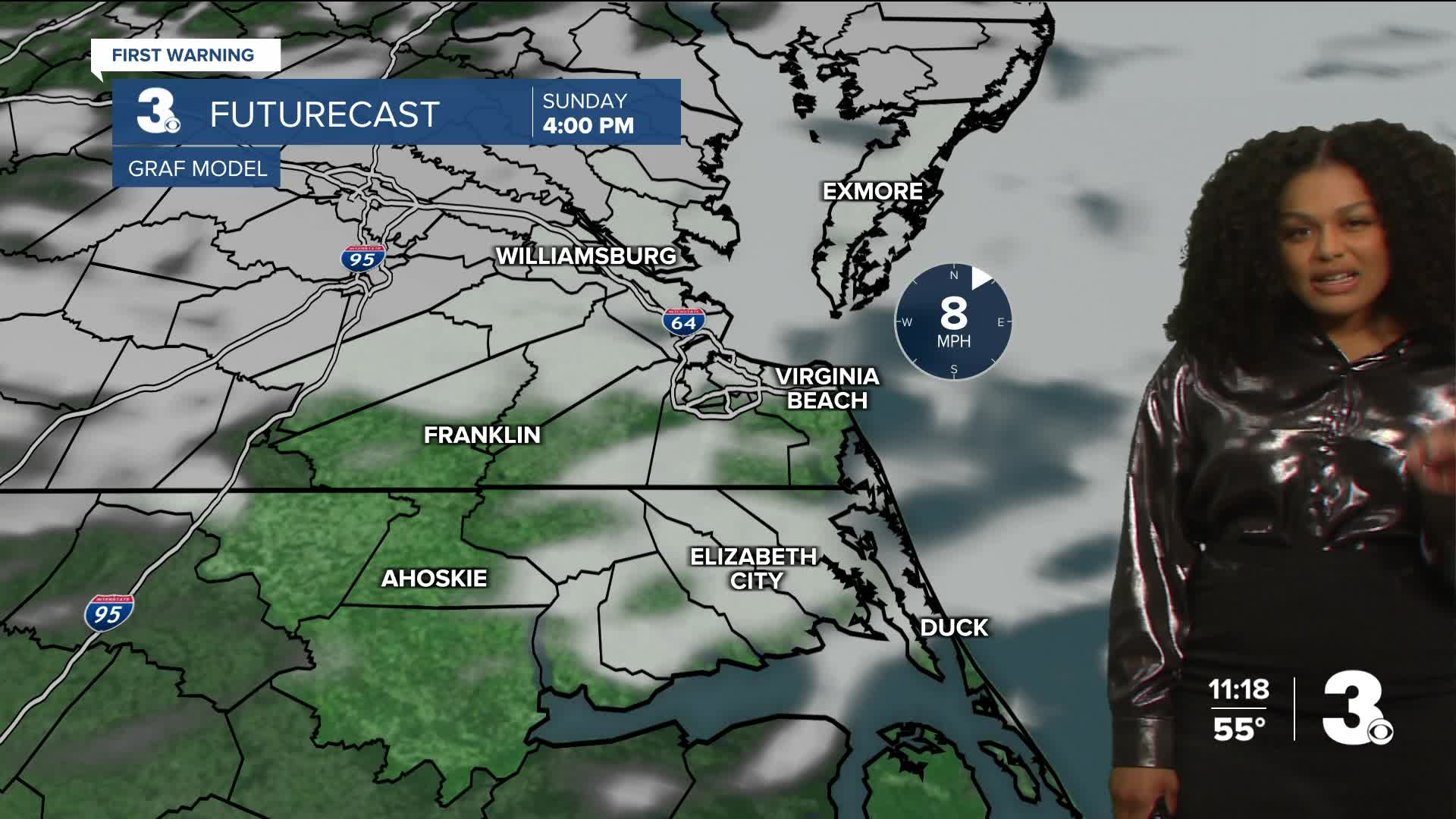 More clouds build in Sunday with highs in the low to mid 60s. A few spotty showers will be possible but most locations will remain dry.