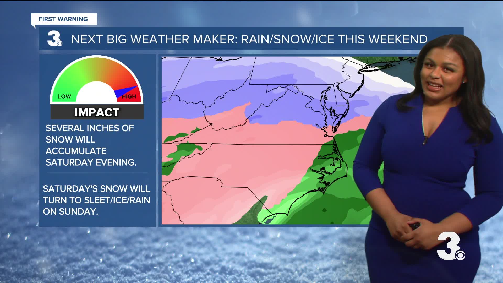 All eyes are on the weekend and a building winter storm. Saturday will be very cold, but the day will start out sunny. Clouds quickly fill in during the evening. The snow begins Saturday night. It will likely look like a “winter wonderland” come Sunday morning but once the rain begins Sunday afternoon, it will start to wash any snow we’ve accumulated and turn it into a slushy mess.