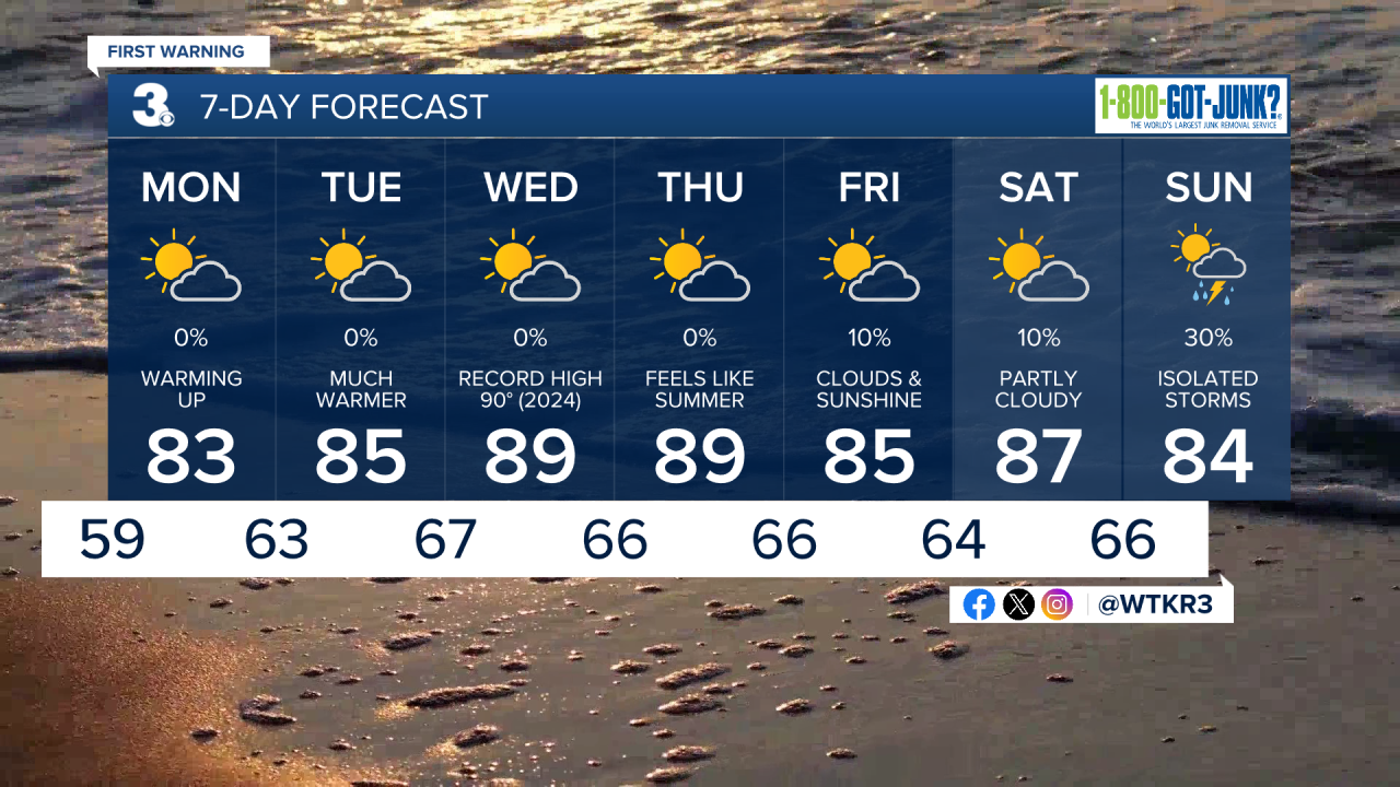 Temperatures continue climbing through the middle of the week. Highs hover around 90 degrees by Wednesday.