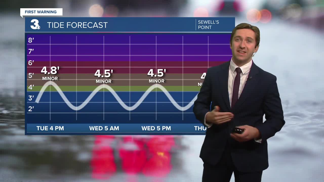 Cloudy skies will stay in place today with patchy drizzle possible. It will be cool and breezy, with highs in the 60s along with winds out of the N at 10-20 mph, gusting up to 30 mph. Tonight our skies will clear on out, with lows dropping into the upper 50s and low 60s. Another round of tidal flooding is possible this afternoon around 3/4 PM, with minor tidal flooding expected. A coastal flood advisory is in place until 7 pm. Rough seas are expected again, with 6-8 foot waves on the Atlantic and 4-6 foot waves expected on the Chesapeake, a small craft advisory is in place.