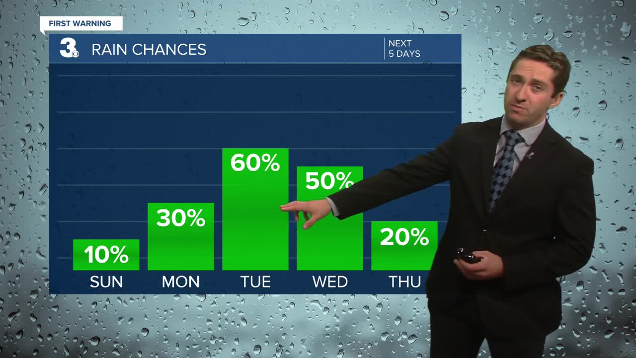 On Wednesday things will start to dry out, with some lingering showers possible throughout the day along with mostly cloudy skies and calmer winds. Highs will stay in the 70s through Thursday, with clearing expected by Thursday afternoon.