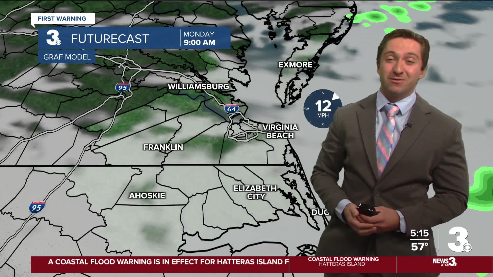 Today will be mostly cloudy along with some showers and drizzle possible, particularly in Northeast North Carolina and the Outer Banks. Highs will reach the upper 50s to low 60s. It will be windy, with winds out of the NE at 10-20 mph by this afternoon. Seas will be rough, with 3-5 foot waves on the Atlantic and 2-3 foot waves on the Chesapeake, a small craft advisory is in place. Overnight temperatures will hover in the 50s as steady rain moves in.