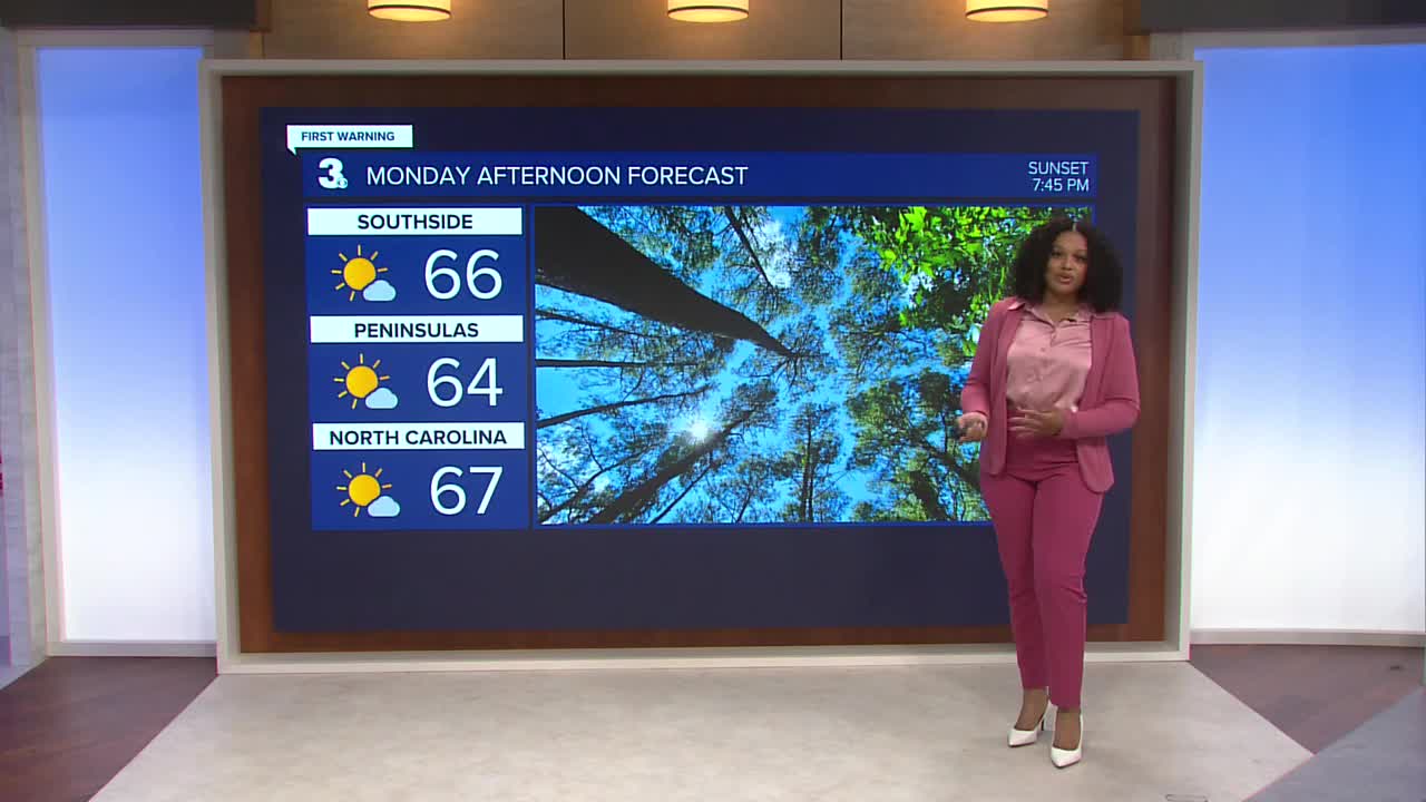 A dry cold front approaches Monday. A few spotty showers will be possible in the morning with clearing skies in the afternoon. Highs will be in the low to mid 60s.