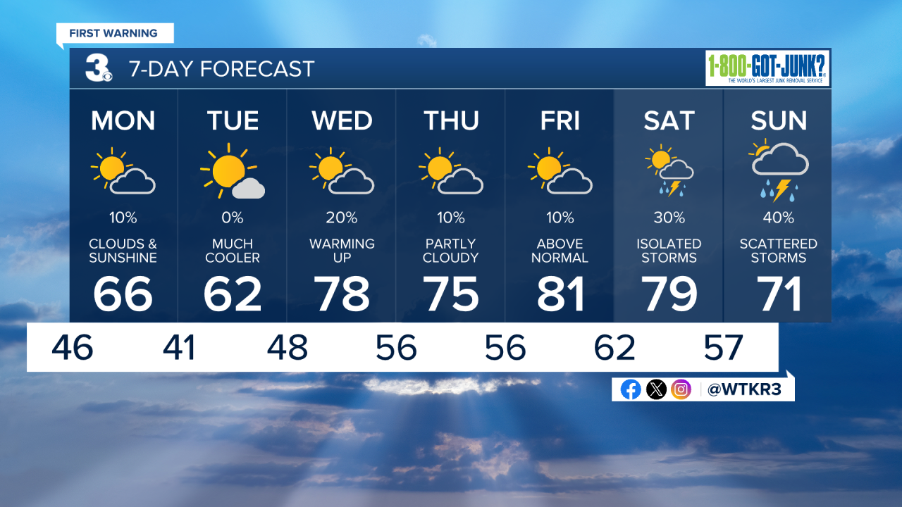 Warmer temperatures and spotty showers return during the middle of the week. Highs will reach the 80s by Friday.
