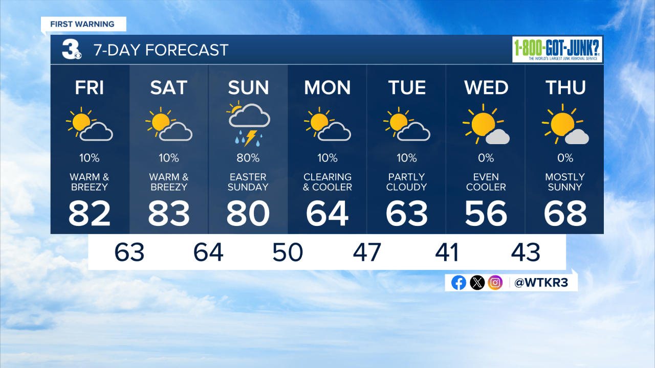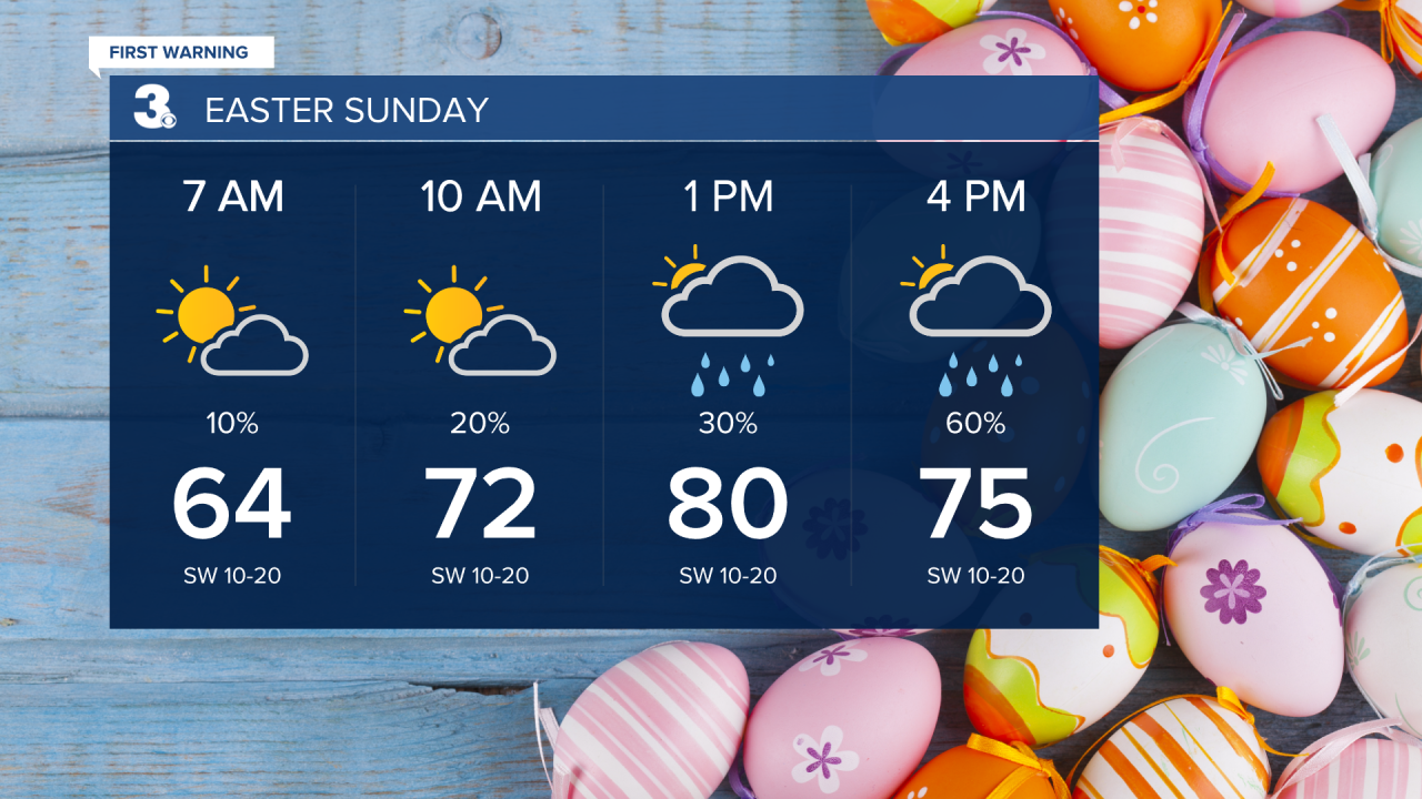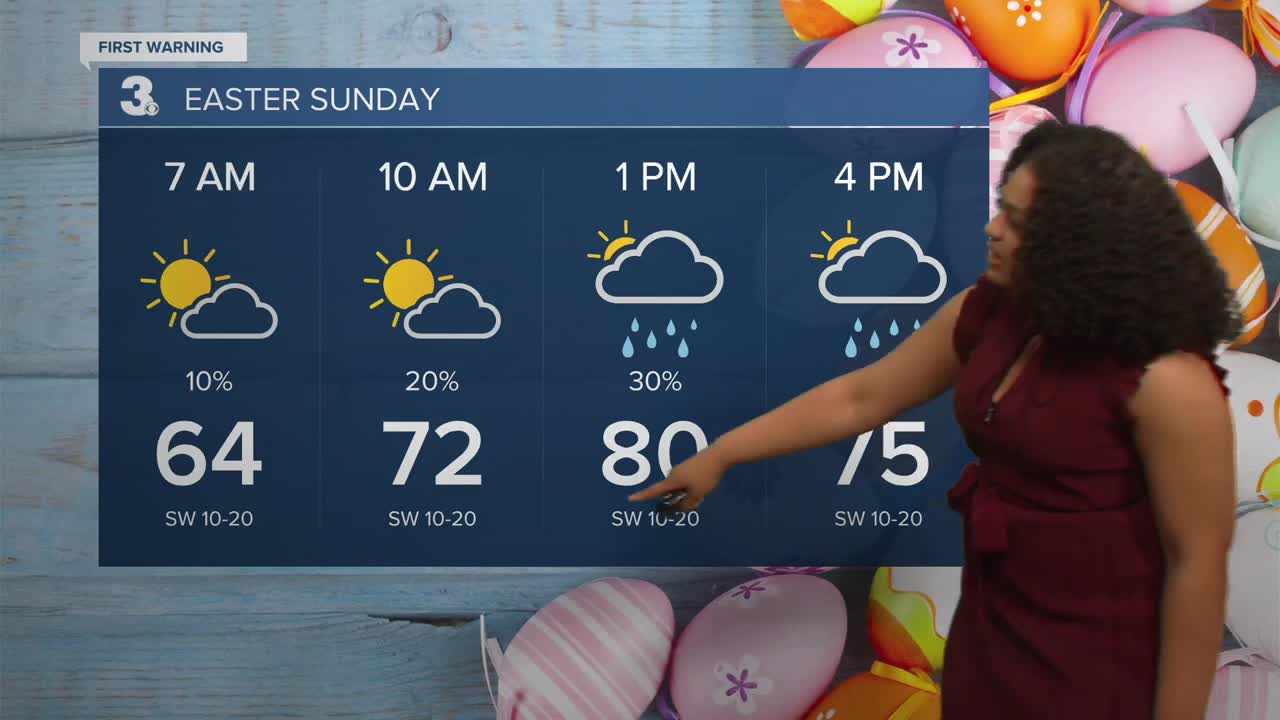 Saturday will be warm and sunny with highs in the mid 80s. Rain returns this Easter Sunday with an approaching cold front. Highs will be in the low 80 Sunday afternoon. The day will start out dry, but shower chances increase during the afternoon and evening.
