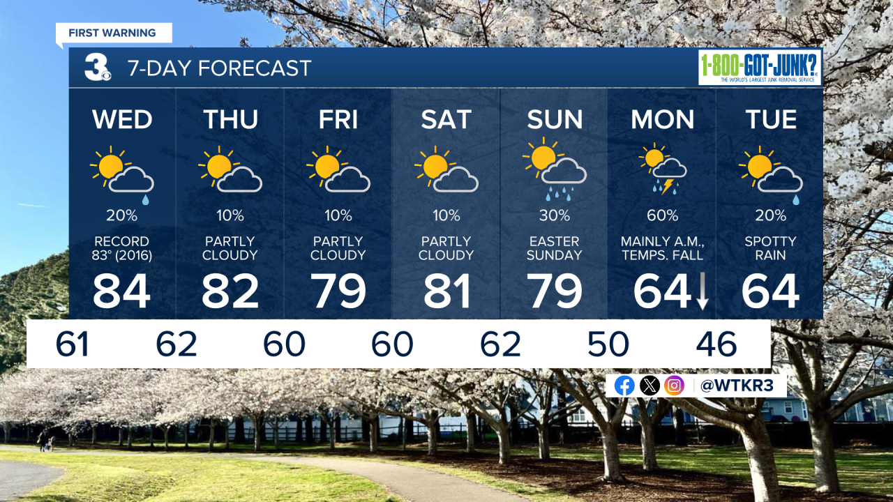 Easter weekend is looking great for egg hunts! Warm weather continues into Saturday and Sunday, with just a 30% chance of a shower late on Sunday evening. Rain moves in Sunday night into Monday morning, with cooler temperatures following.