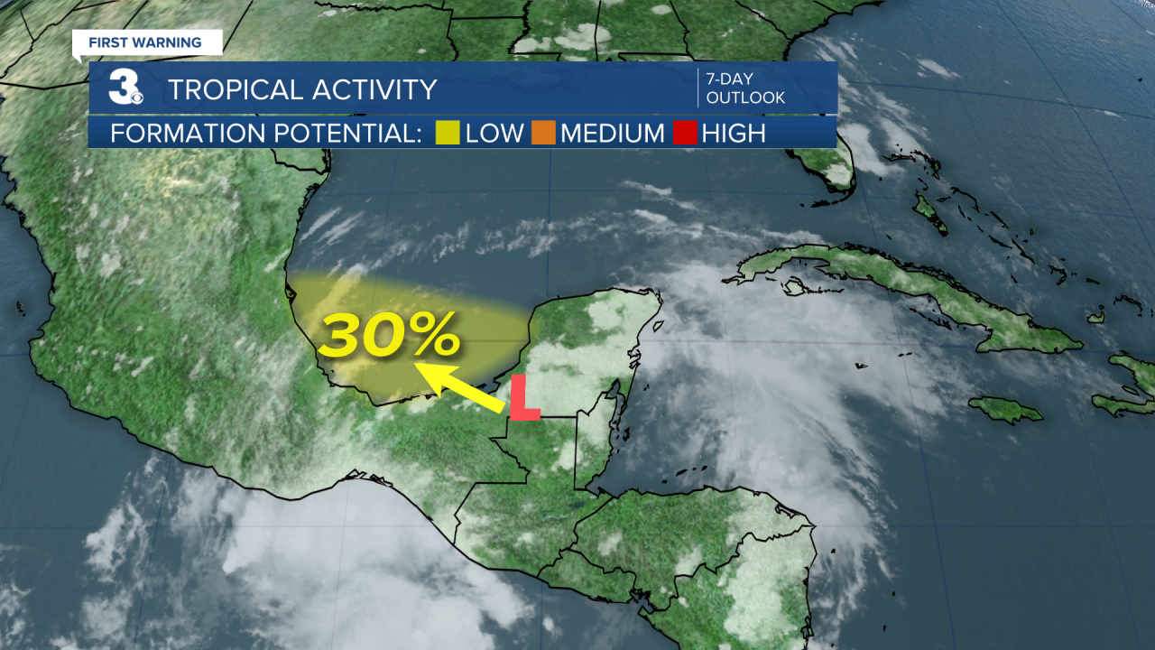 An area of low pressure has formed over the Yucatan Peninsula. It is expected to move west-northwestward this weekend into the Bay of Campeche. There is a 30% chance of hurricane development within the next week.