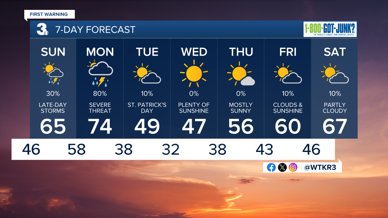 Highs Monday reach the mid 70s but temperatures plunge into the 40s on St. Patrick’s Day Tuesday. Temperatures gradually moderate closer to average by the end of next week.