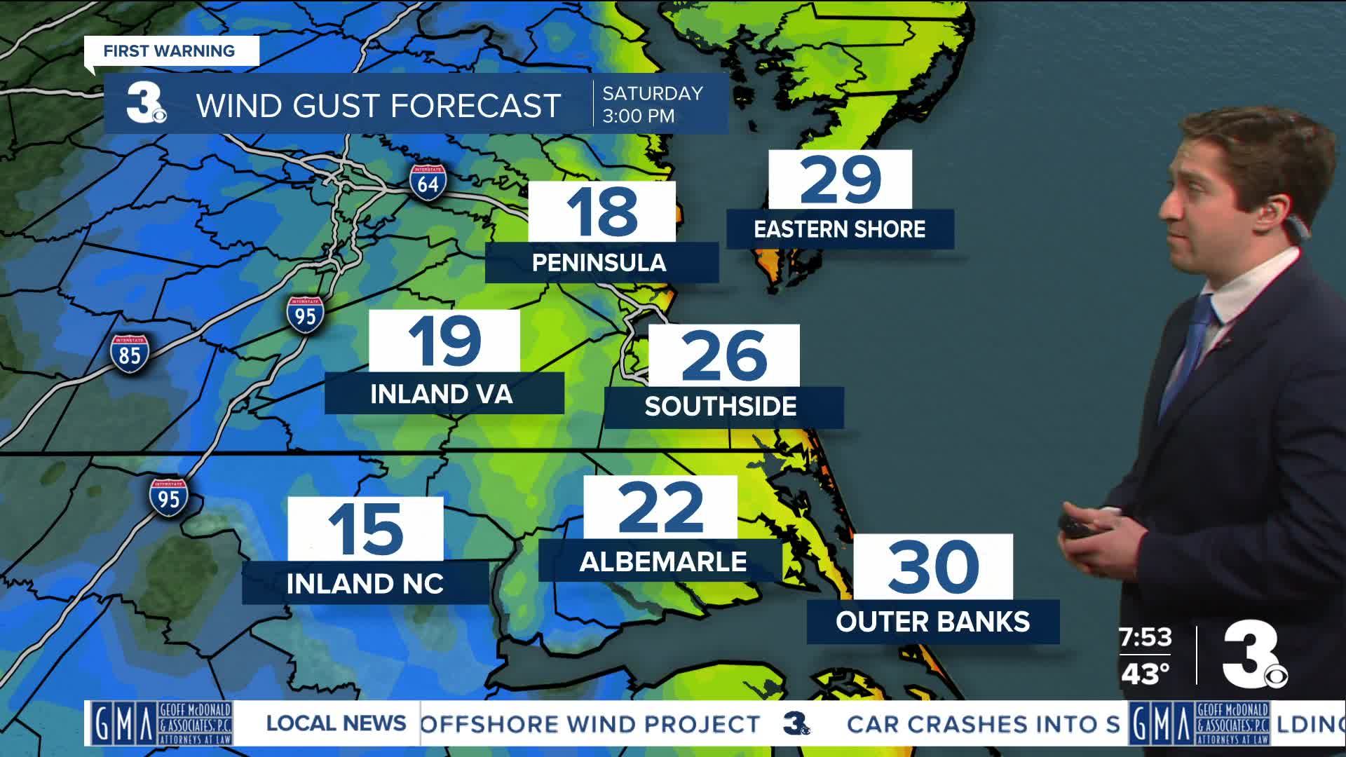 Tuesday will be sunny and cool with highs in the low 40s. We'll stay in the 40s through New Year's Day, with mainly dry conditions expected. Friday looks to be the coldest day of the next 7, as another wave of cold air moves through Hampton Roads.