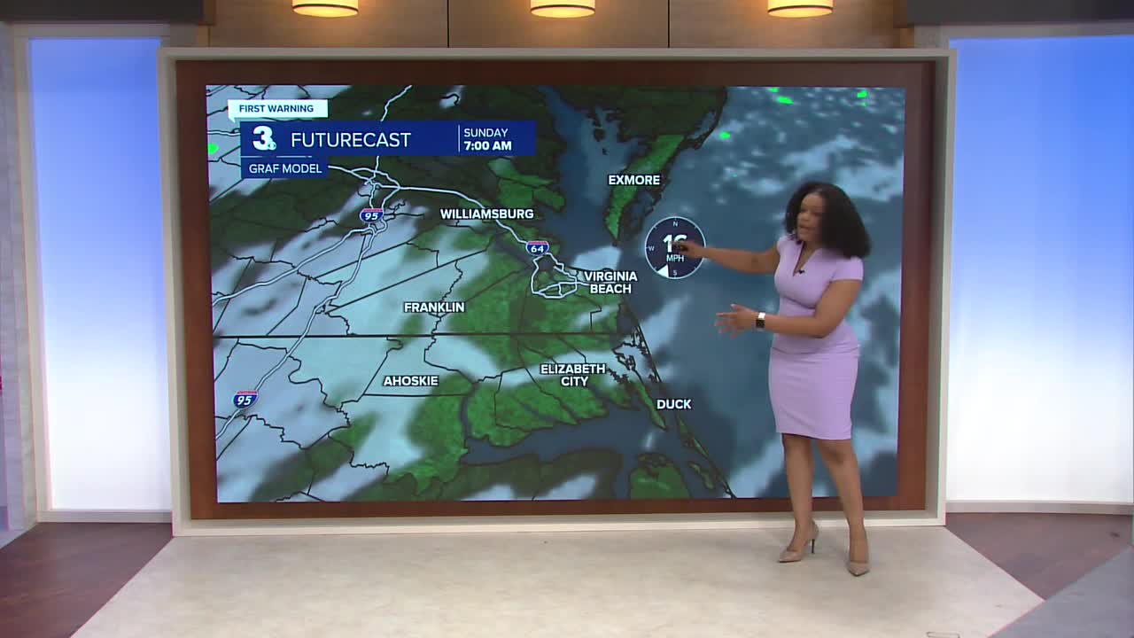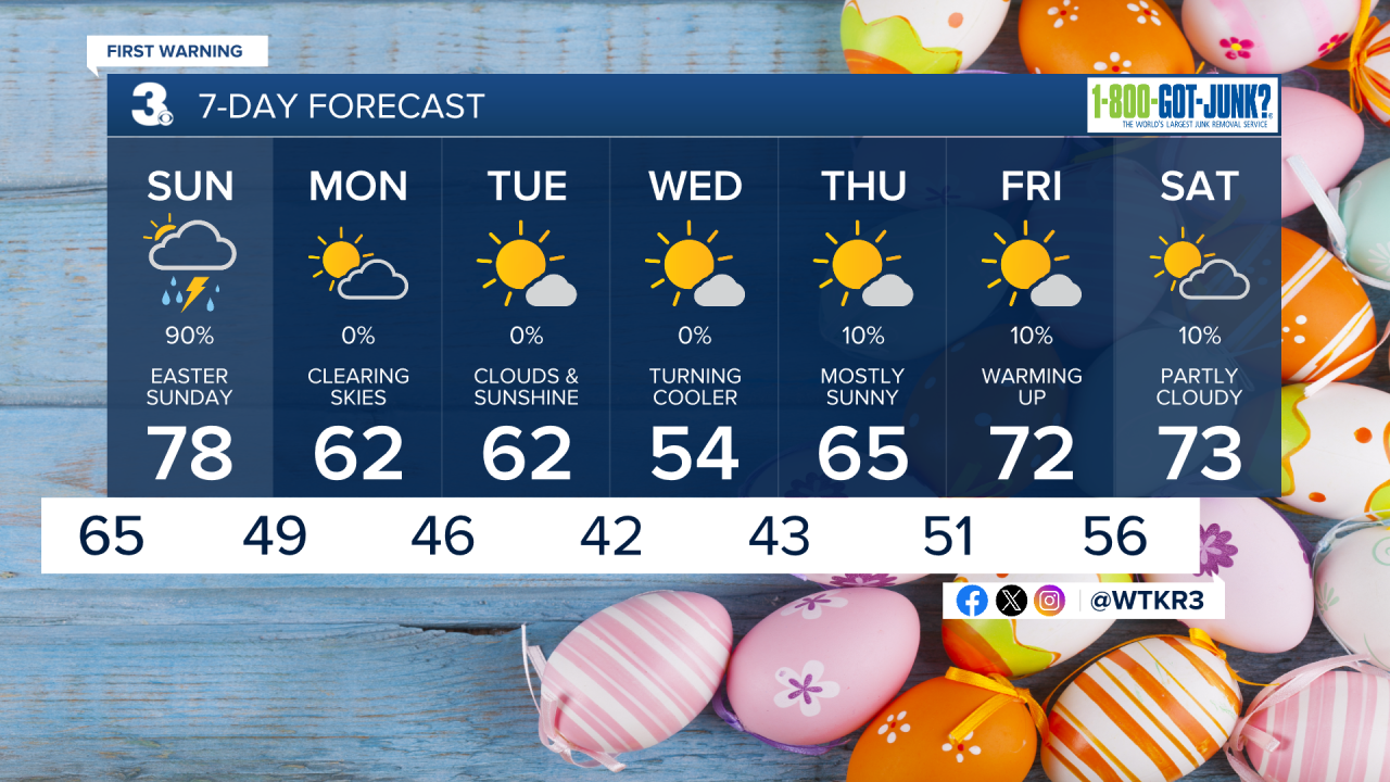 Sunday morning will be dry. Sunrise will be at 6:42 am. Clouds increase throughout the morning. Showers and thunderstorms arrive in the afternoon. Highs will reach the upper 70s. There is a level 1 out of 5 severe weather threat in place. Damaging wind gusts will be possible. The line of storms exits the region late Sunday night.